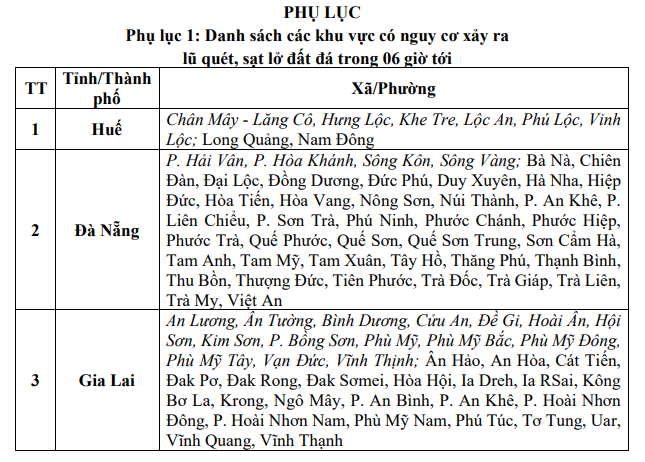 Cơ quan khí tượng cảnh báo nguy cơ sạt lở đất, lũ quét do mưa lớn ở một số xã/phường thuộc thành phố Huế, Đà Nẵng và tỉnh Gia Lai.