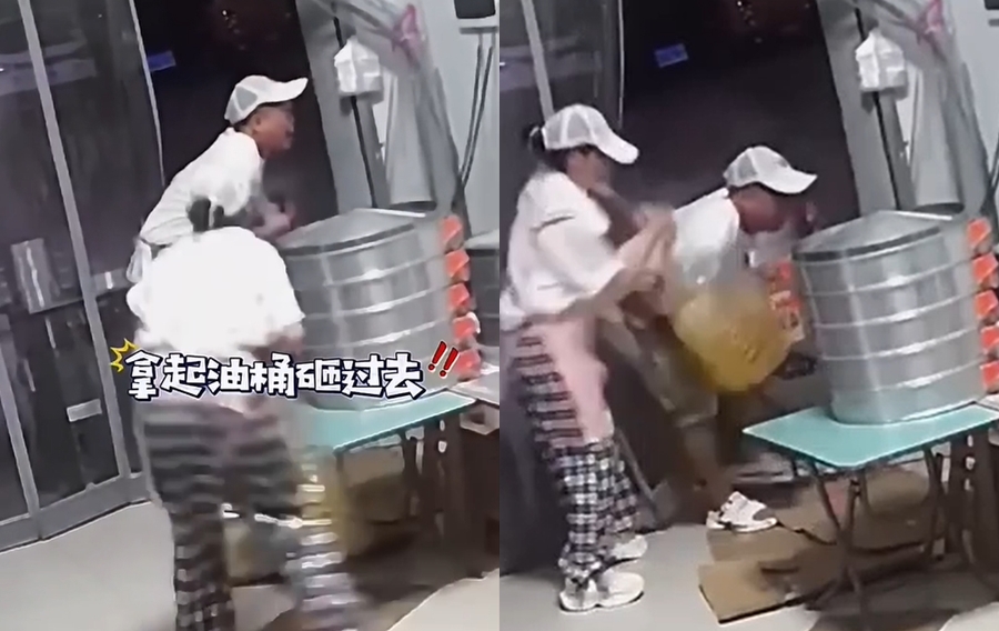 Tuy nhiên, cô không hành động hấp tấp vì biết nếu chạm trực tiếp vào chồng, cô cũng sẽ bị điện giật. Lập tức, người vợ dùng một thùng dầu nhựa ném vào chồng, cố gắng giải thoát anh khỏi đường dây điện.