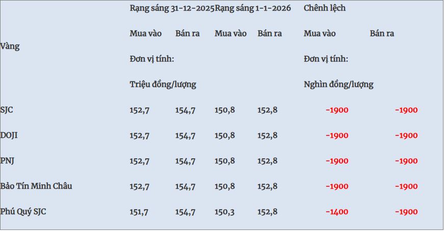 So với sáng qua, giá vàng miếng hôm nay (1-1-2026) đồng loạt giảm sâu.