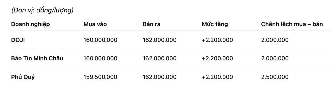 Tính đến 9h15, giá vàng miếng SJC được Tập đoàn DOJI niêm yết ở ngưỡng 160-162 triệu đồng/lượng (mua vào – bán ra), tăng 2,2 triệu đồng/lượng cả hai chiều. Chênh lệch giá mua vào – bán ra ở ngưỡng 2 triệu đồng/lượng.