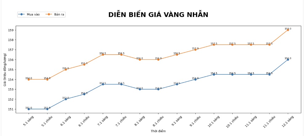 Tính đến 9h15, Tập đoàn DOJI niêm yết giá vàng nhẫn ở ngưỡng 156-159 triệu đồng/lượng (mua vào – bán ra), tăng 1,5 triệu đồng/lượng cả hai chiều. Chênh lệch mua vào – bán ra ở mức 3 triệu đồng/lượng.
