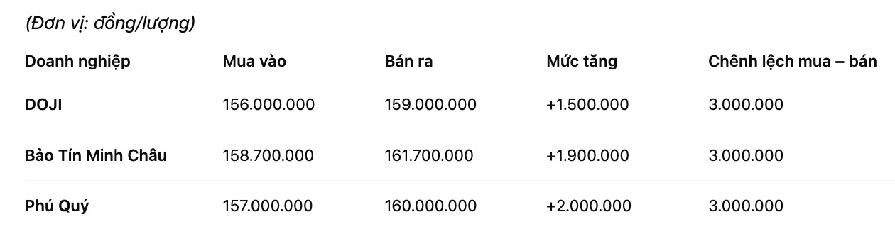 Tập đoàn Vàng Bạc Đá Quý Phú Quý niêm yết giá vàng miếng SJC ở ngưỡng 159,5-162 triệu đồng/lượng (mua vào – bán ra), tăng 2,2 triệu đồng/lượng cả hai chiều. Chênh lệch giá mua vào – bán ra ở ngưỡng 2,5 triệu đồng/lượng.