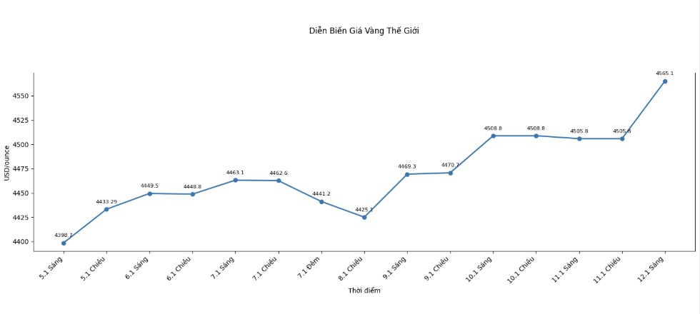 Lúc 9h17, giá vàng thế giới niêm yết quanh ngưỡng 4.565,1 USD/ounce, tăng 56,3 USD so với một ngày trước.