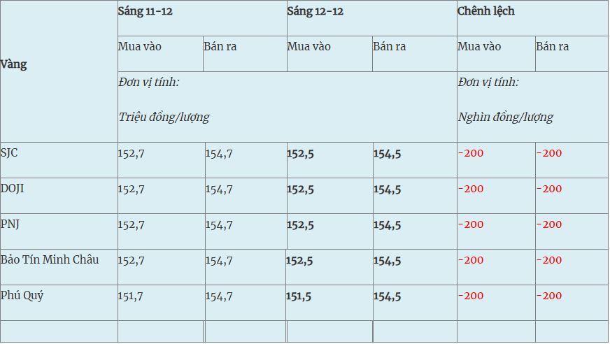 Giá vàng hôm nay (12-12): Giá vàng miếng giảm 200.000 đồng/lượng ở cả hai chiều, bán ra ở mức 154,5 triệu đồng/lượng; vàng nhẫn Bảo Tín Minh Châu và Phú Quý tăng 400.000 – 500.000 đồng/lượng; vàng thế giới tăng vượt mạnh.