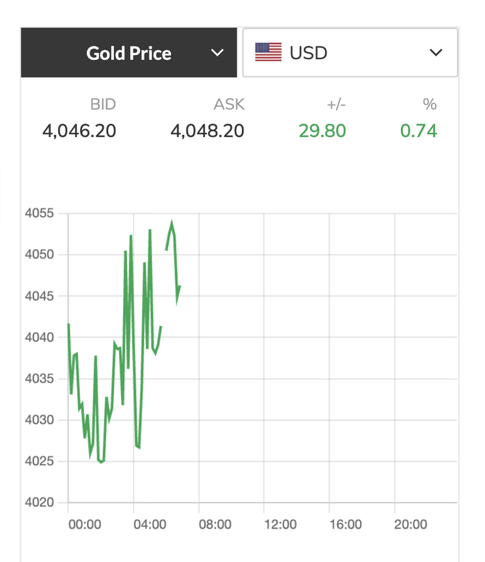 Lúc 8 giờ ngày 13-10, theo giờ Việt Nam, giá vàng thế giới tăng vọt lên 4.048 USD/ounce, tăng tới 30 USD/ounce so với phiên cuối tuần và đang hướng trở lại mốc đỉnh lịch sử, 4.060 USD/ounce từng lập vào tuần trước.